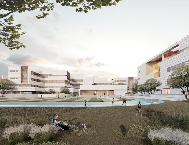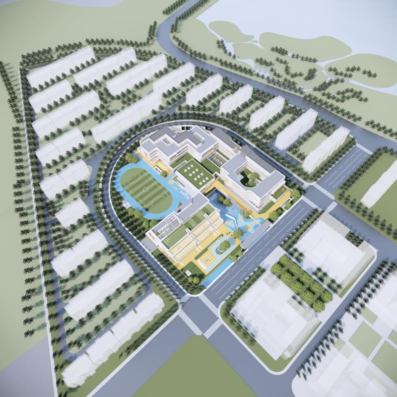 小学部分建筑面积为28190平方米,建筑主体结构为四层,包括自然教室、美术教室、劳动教室、音体教室、书法教室、校史馆等。小学规划有36个教学班,可提供学位1620个。在规划设计上,小学将借鉴嵩山书院、白鹿洞书院的风格,通过营造围合空间,打造现代书院氛围。为给学生们提供充分的室外活动空间,教学楼合围而成的院落和屋顶花园都将设置为班级活动场地。此外,小学建筑结构的整体造型将呈弧线形,与项目所在地块的地形相呼应。幼儿园部分建筑面积为5400平方米,建筑主体结构为四层,规划有15个教学班,可提供学位450个。